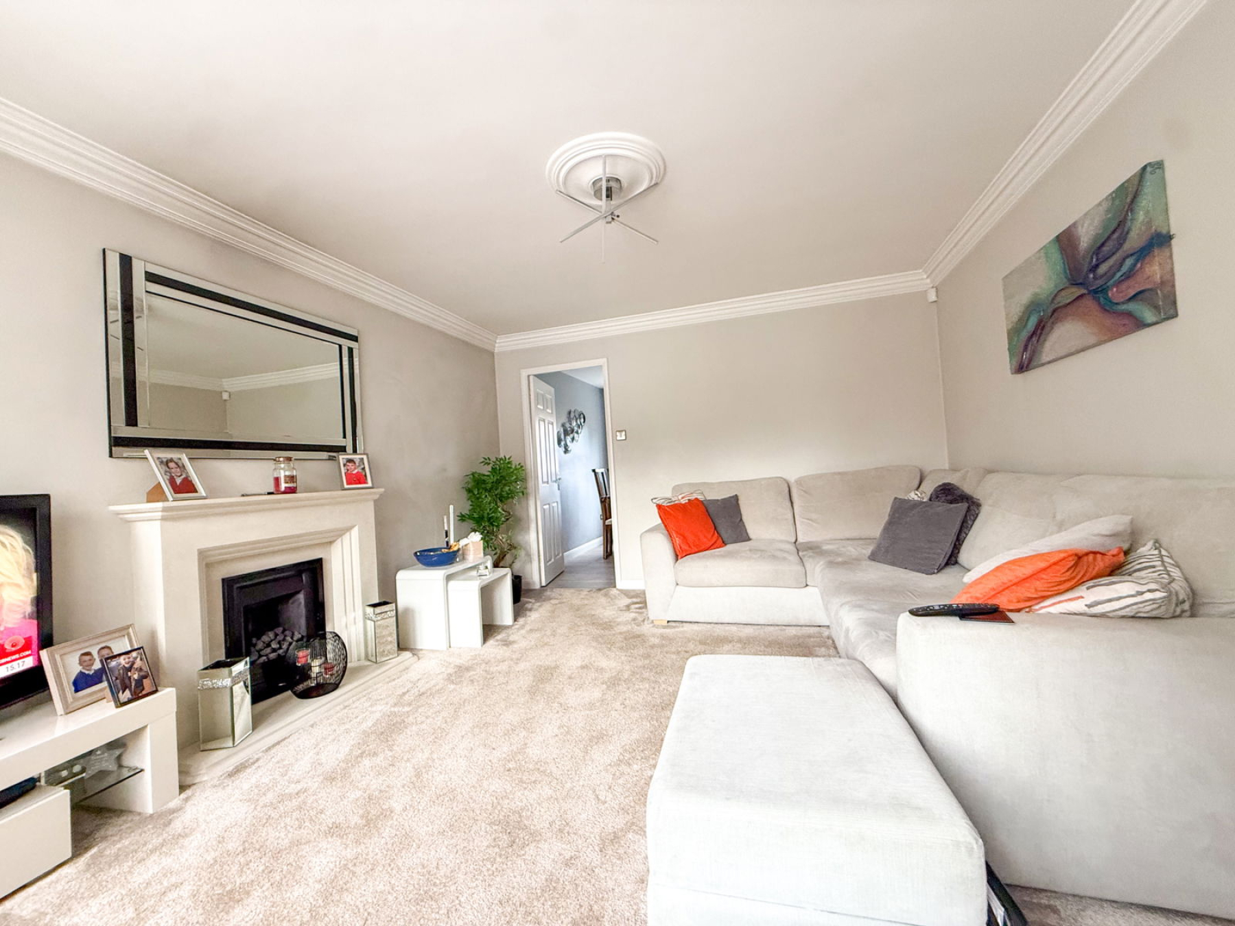 Upon entering through the welcoming porch, you step into the hallway that provides access to the first floor via the staircase and leads seamlessly into the living room. The living area is beautifully decorated, featuring a large bow window that overlooks the front of the property, allowing in plenty of natural light. An elegant fireplace, plush cream and beige carpets, and decorative coving add a touch of sophistication to this comfortable space.