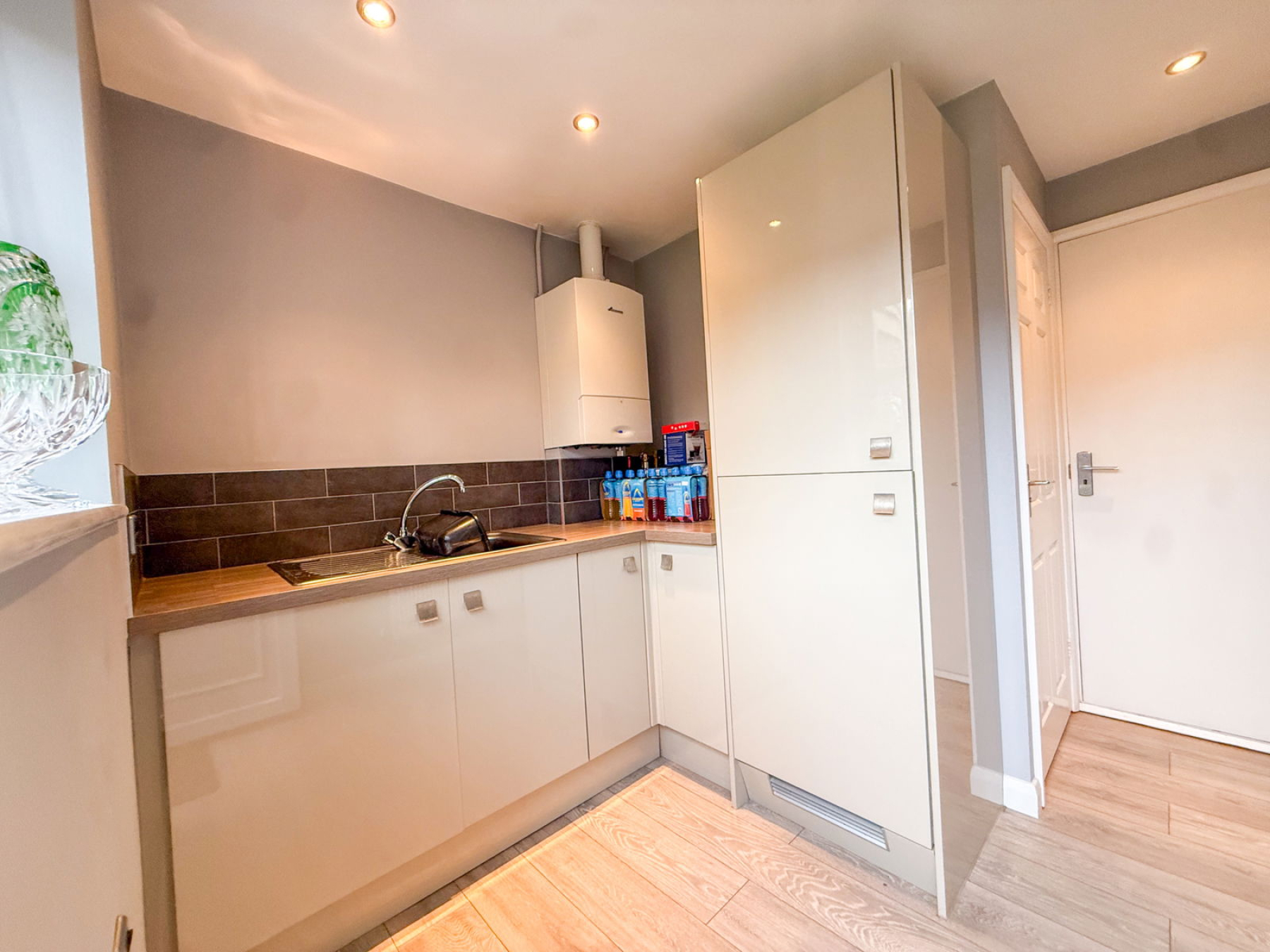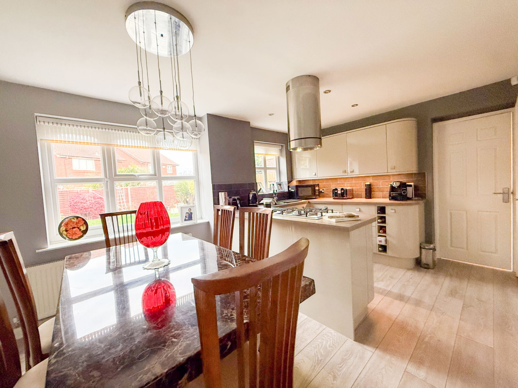 From the living room, you flow into the stylish kitchen and dining area, an ideal family hub. This bright and airy space benefits from two large rear-facing windows overlooking the garden, creating a cheerful atmosphere for family meals and entertaining guests. The contemporary kitchen is thoughtfully designed, providing ample space for a large dining table, perfect for busy family life.