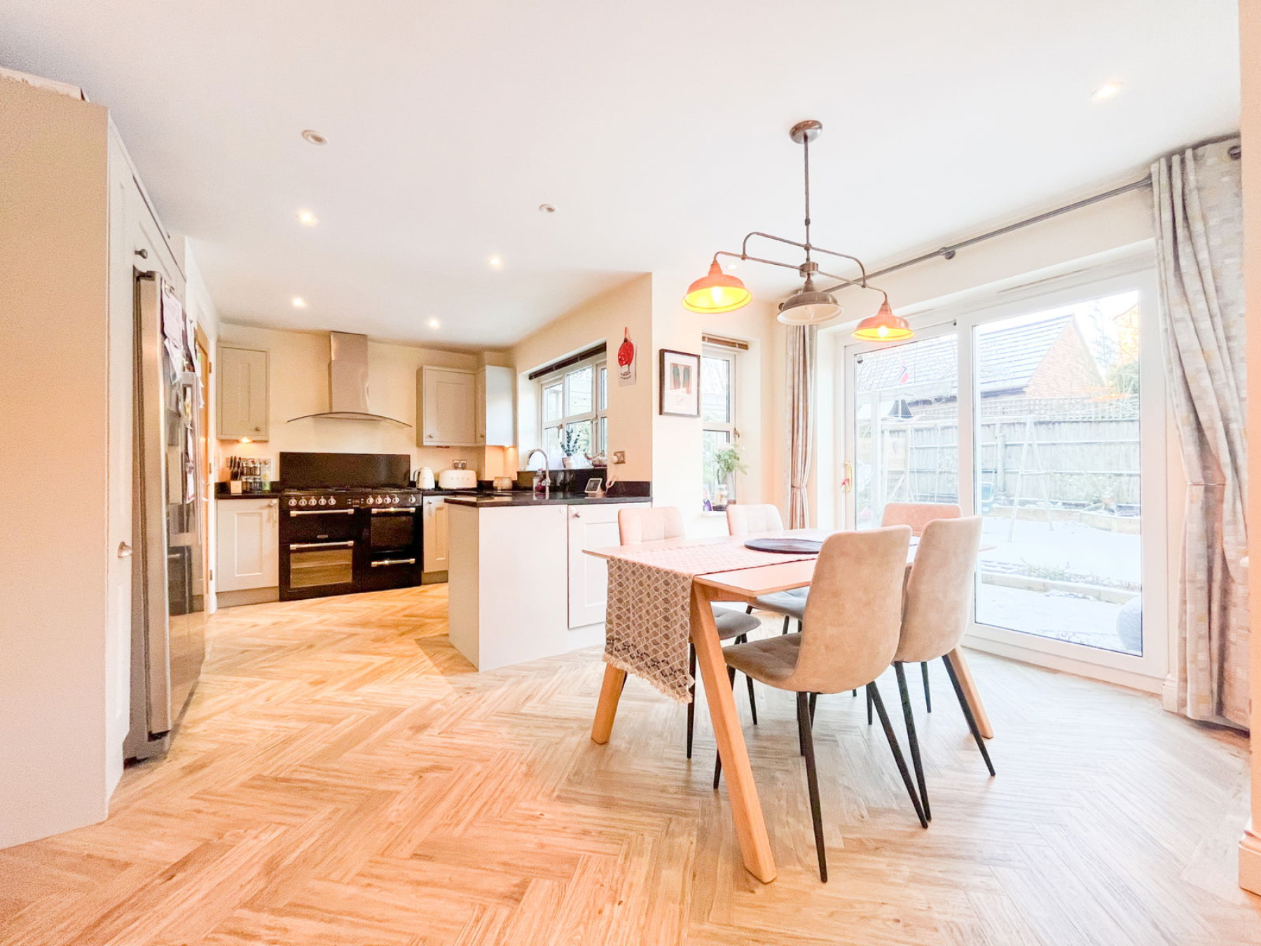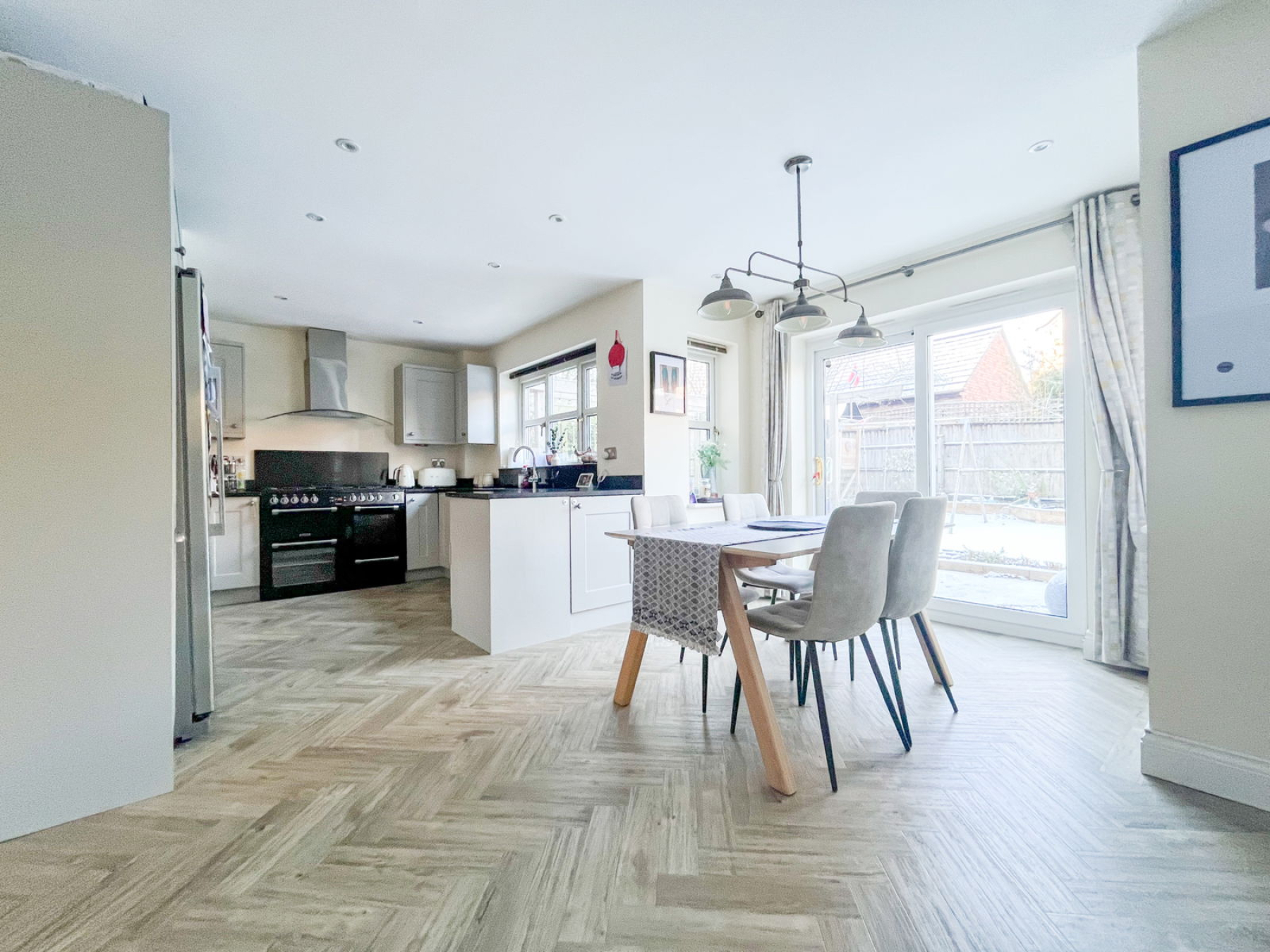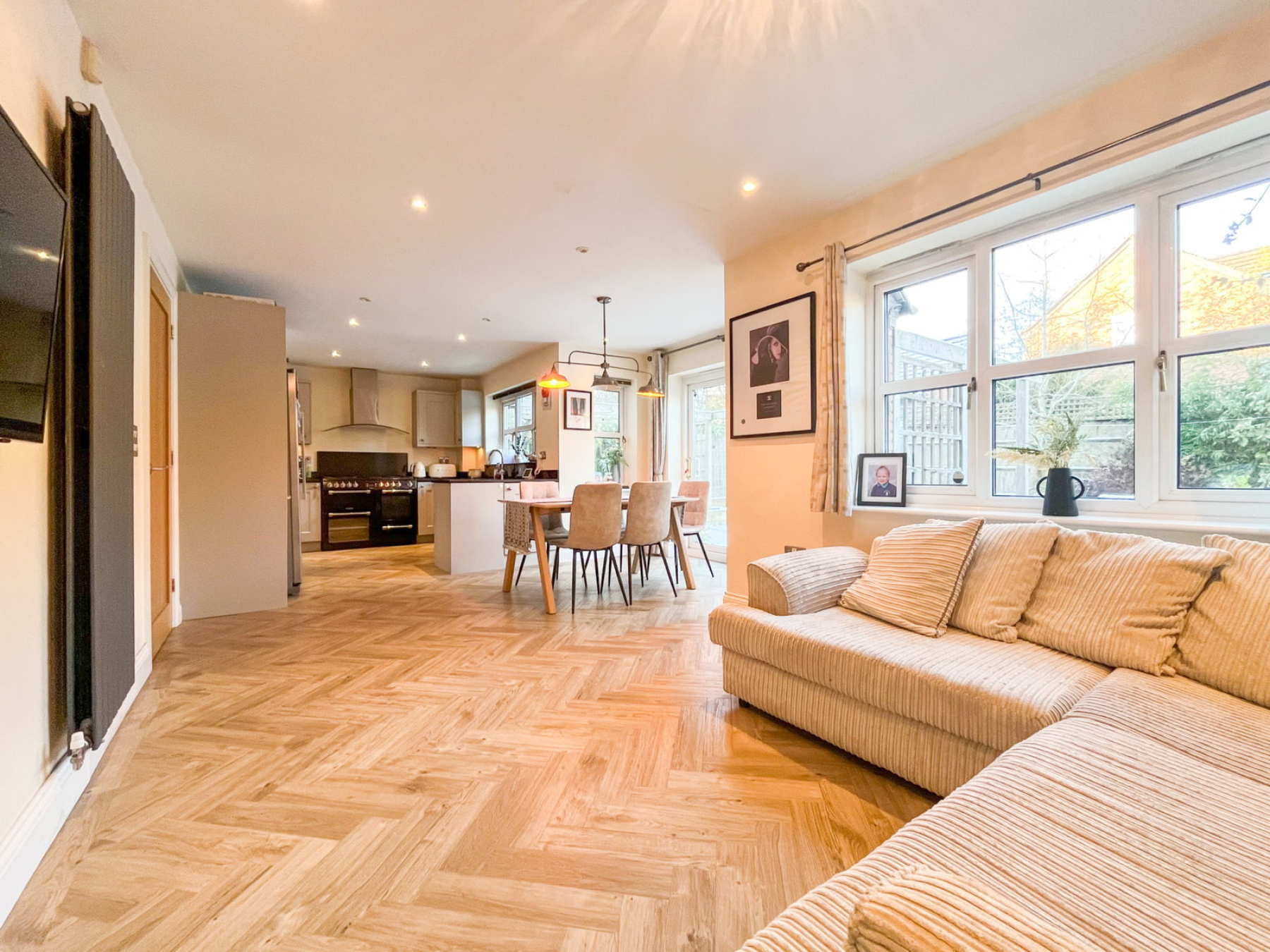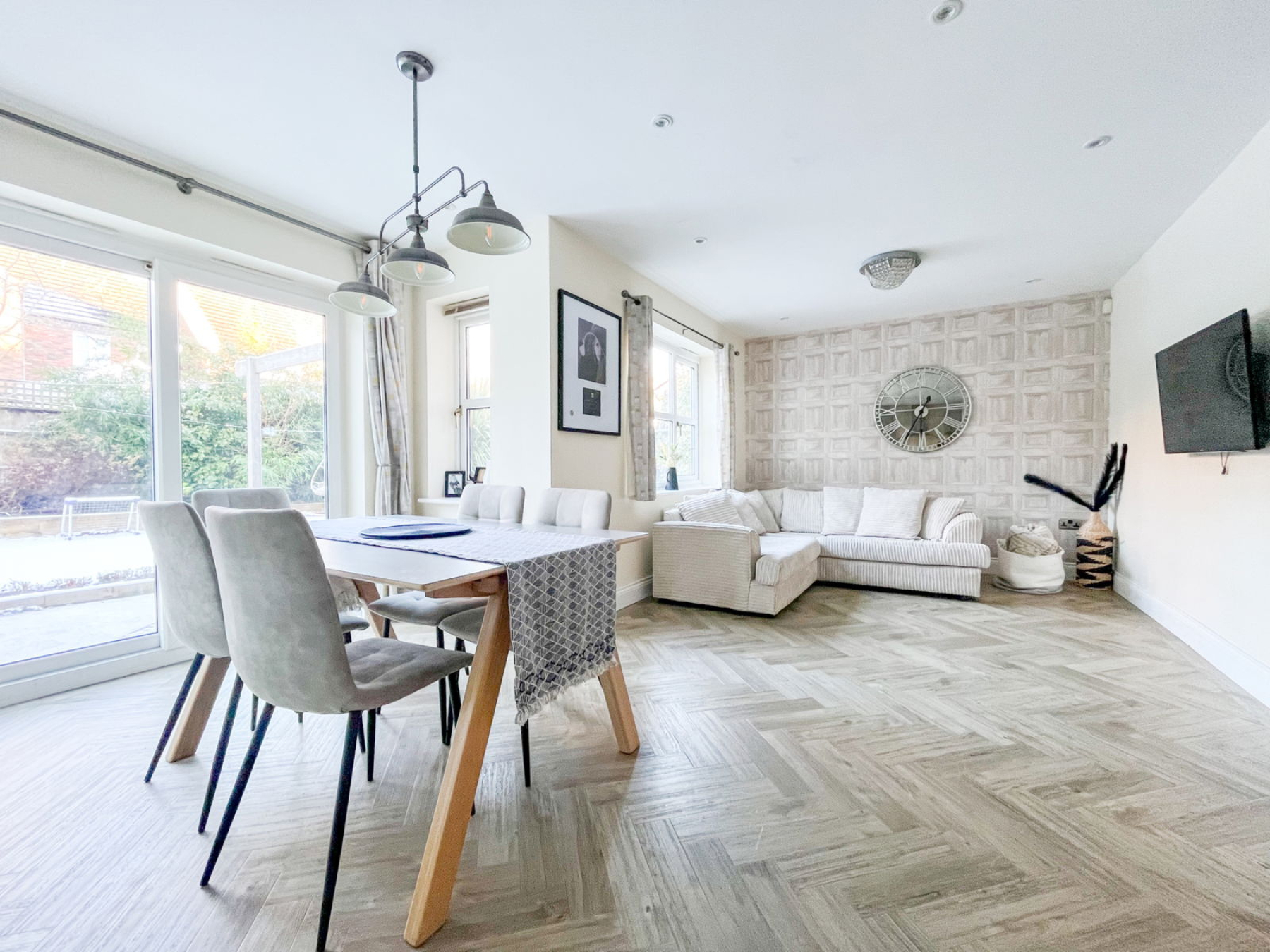 The hallway also provides access to a convenient cloakroom and also leads into the heart of the home—the spacious kitchen/dining area with a family living area. Spanning over 8.5 meters in width, this family-friendly space is designed for busy households, offering ample room for a large dining table and a comfortable seating area where you can unwind while enjoying views of the rear garden. The kitchen features plentiful worktops, numerous storage units, and a utility room with separate access to the rear garden—perfect for daily living and entertaining alike.