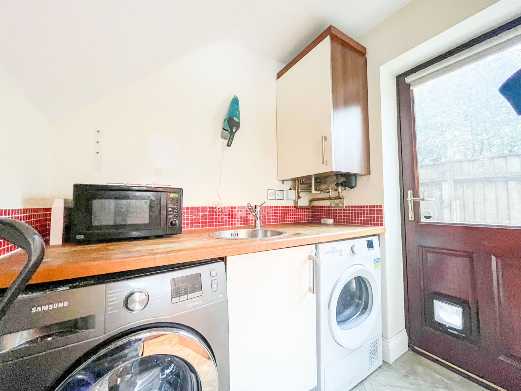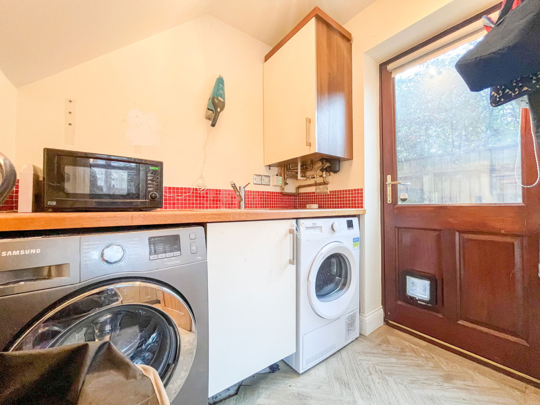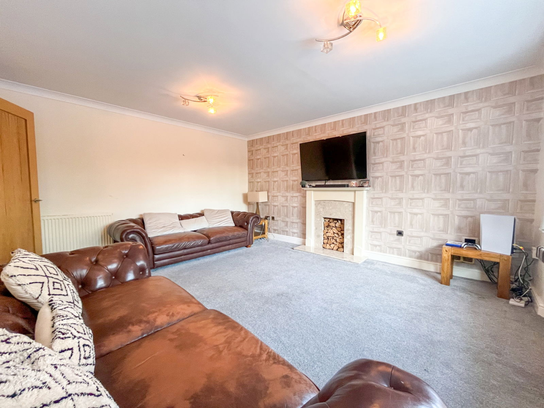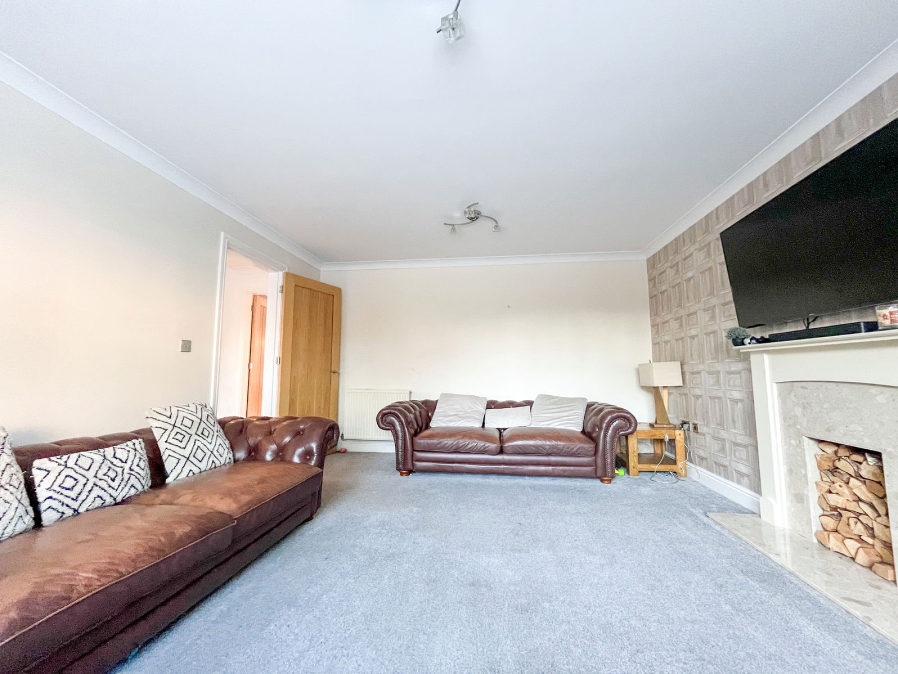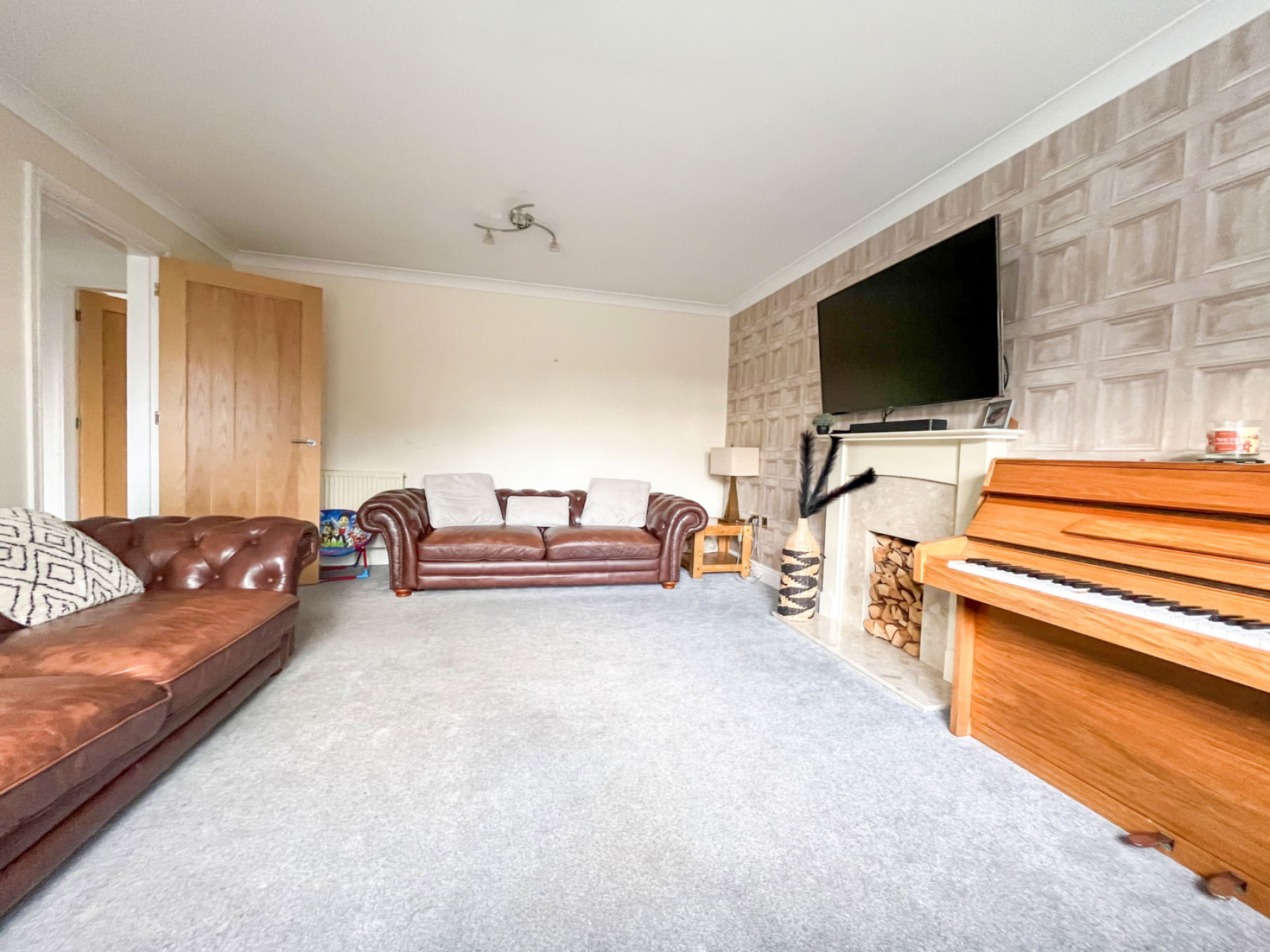 The hallway also provides access to a convenient cloakroom and also leads into the heart of the home—the spacious kitchen/dining area with a family living area. Spanning over 8.5 meters in width, this family-friendly space is designed for busy households, offering ample room for a large dining table and a comfortable seating area where you can unwind while enjoying views of the rear garden. The kitchen features plentiful worktops, numerous storage units, and a utility room with separate access to the rear garden—perfect for daily living and entertaining alike.