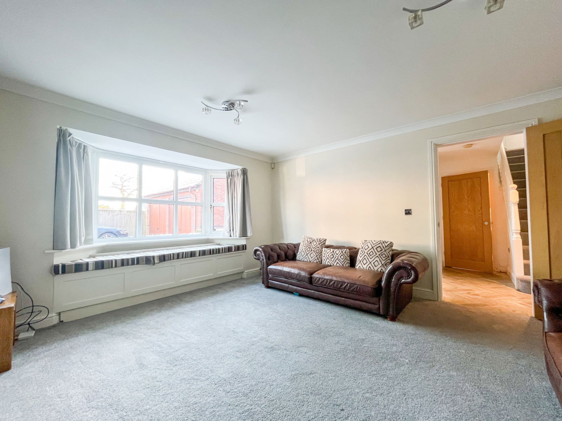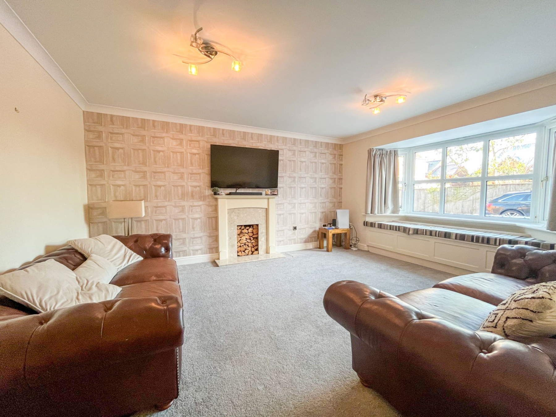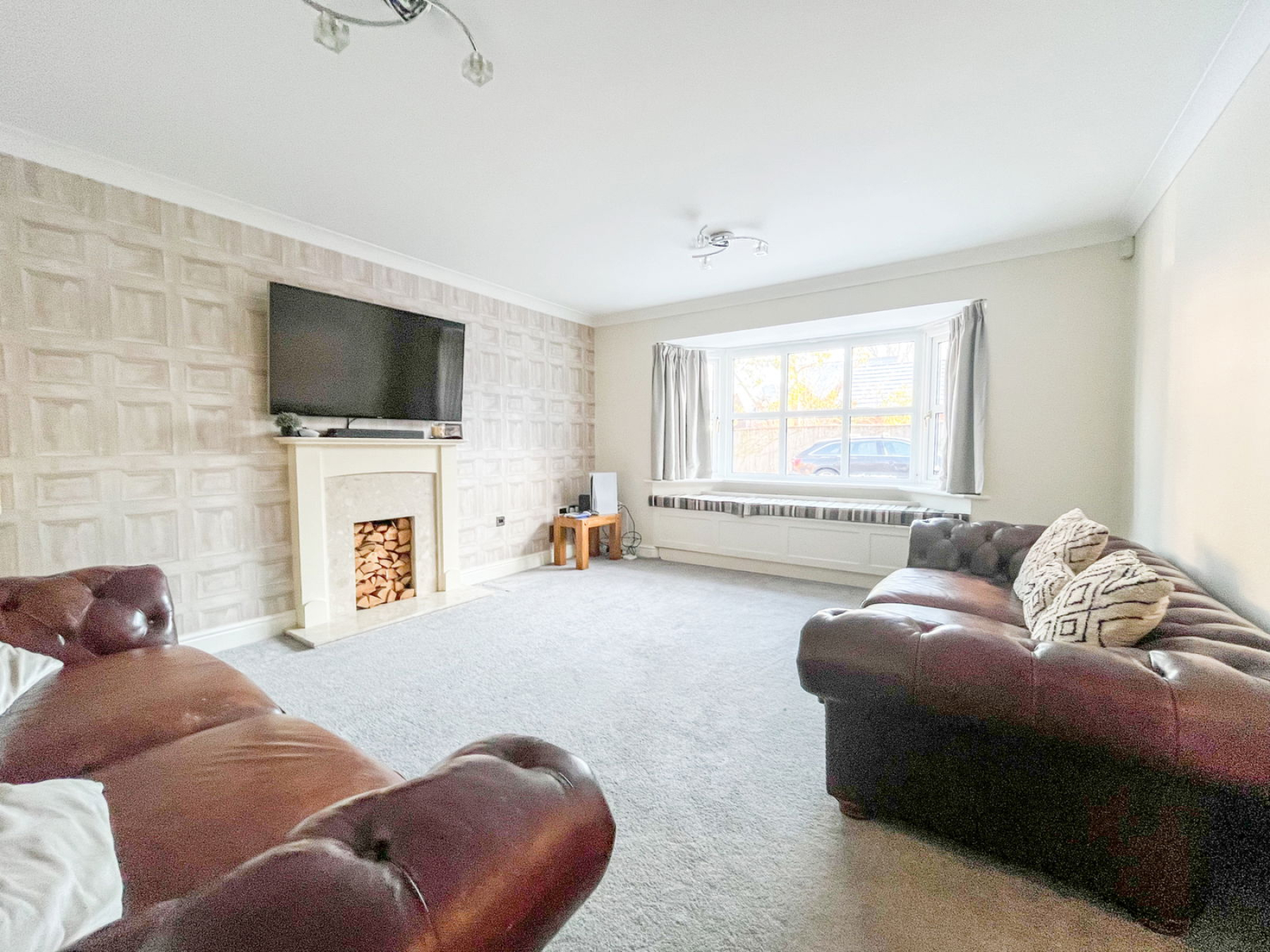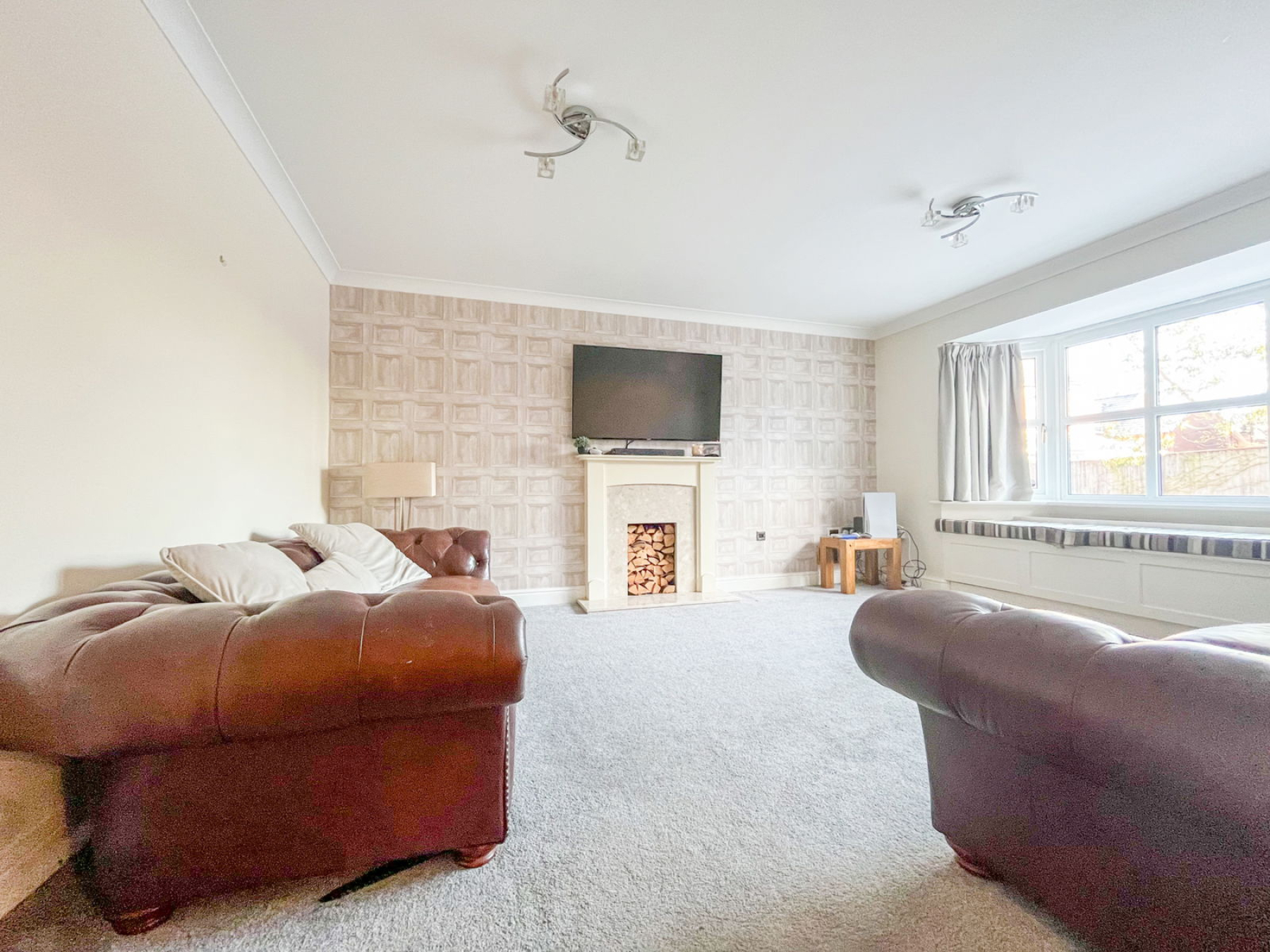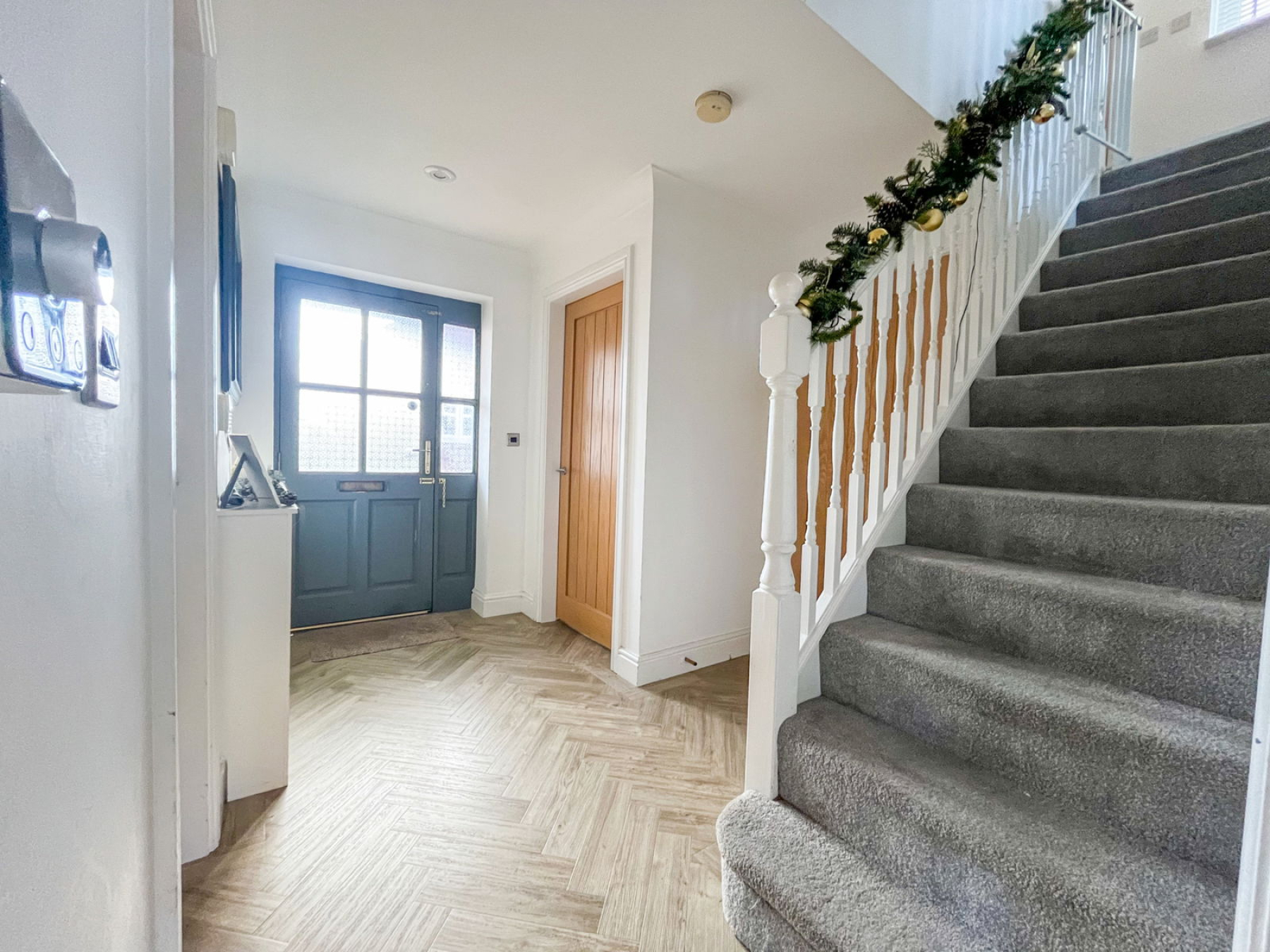 Upon entering, you are greeted by a large, welcoming hallway finished with stylish Karndean herringbone flooring, which flows seamlessly throughout the ground floor. To the left, a versatile study offers a peaceful retreat or a perfect home office. To the right, the formal living room features a generous bay window, elegant decor, decorative coving, and plush carpeting—an ideal space for relaxing and entertaining.