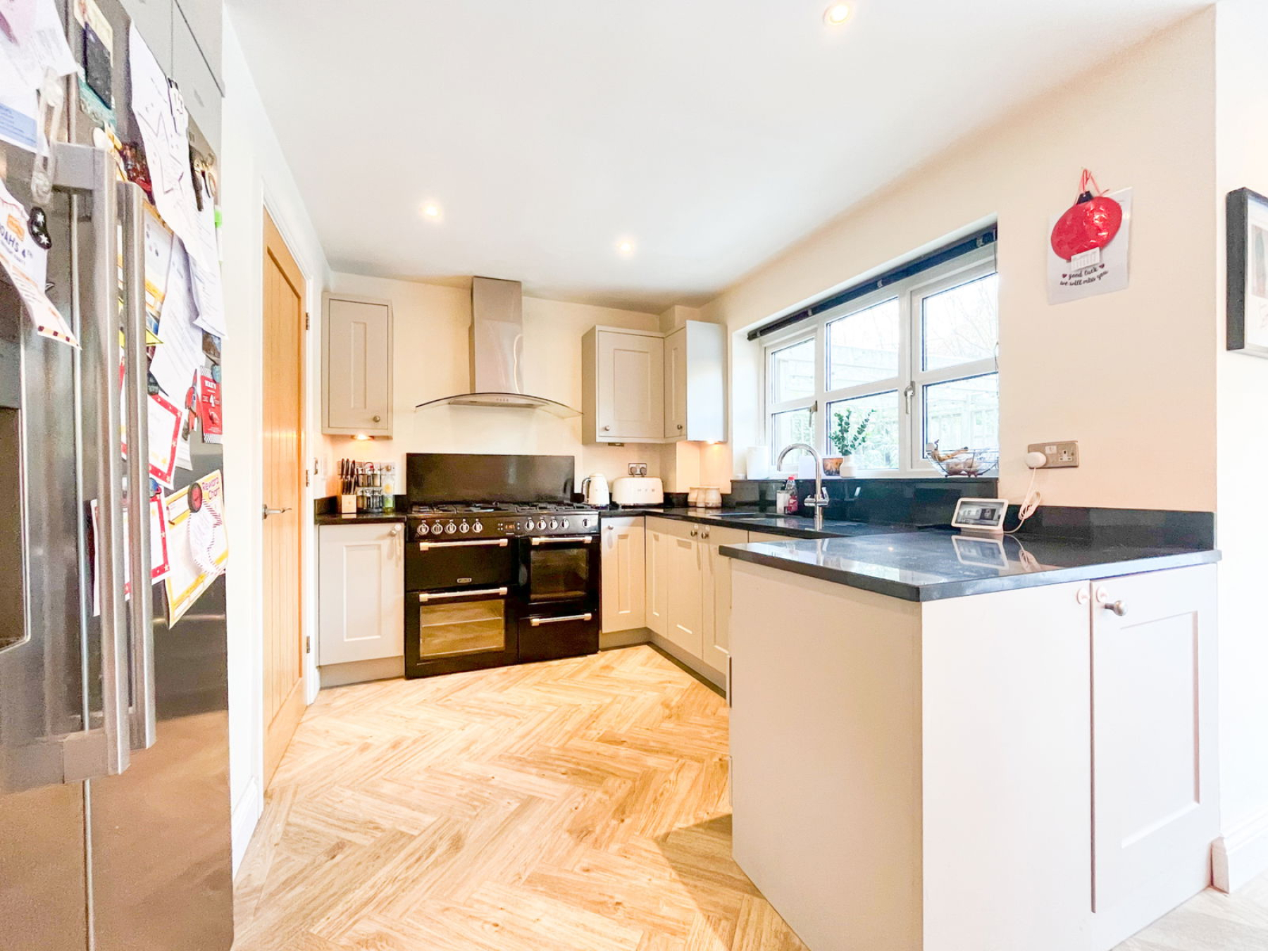 The kitchen opens out to the west-facing garden and a large patio area, ideal for outdoor dining and social gatherings.