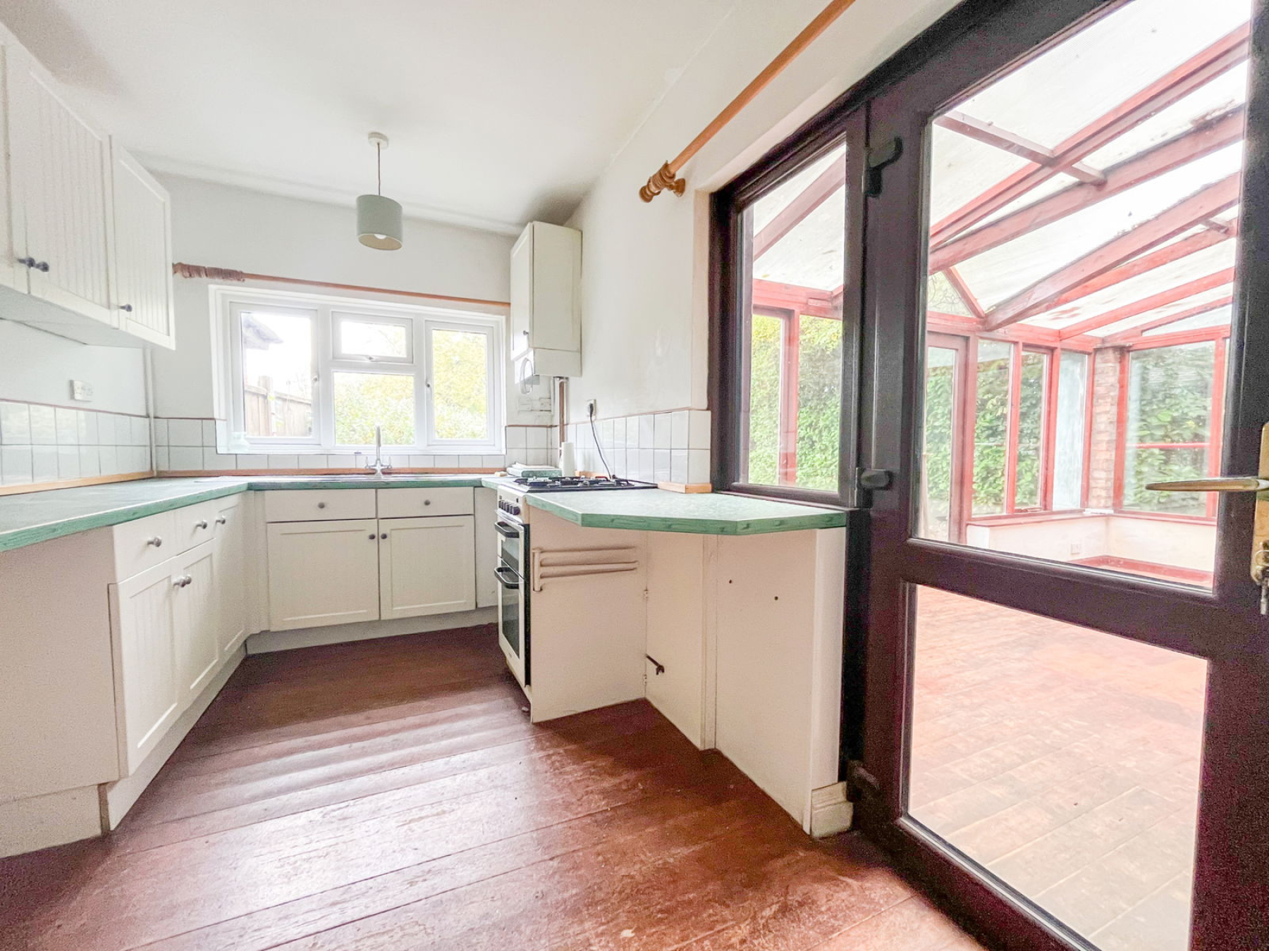 The good-sized kitchen, located adjacent to the sunroom, is in need of modernisation but provides excellent potential. Its spacious layout allows for the creation of an open-plan, family-friendly kitchen by connecting it to the sunroom—offering endless design possibilities to suit your lifestyle.