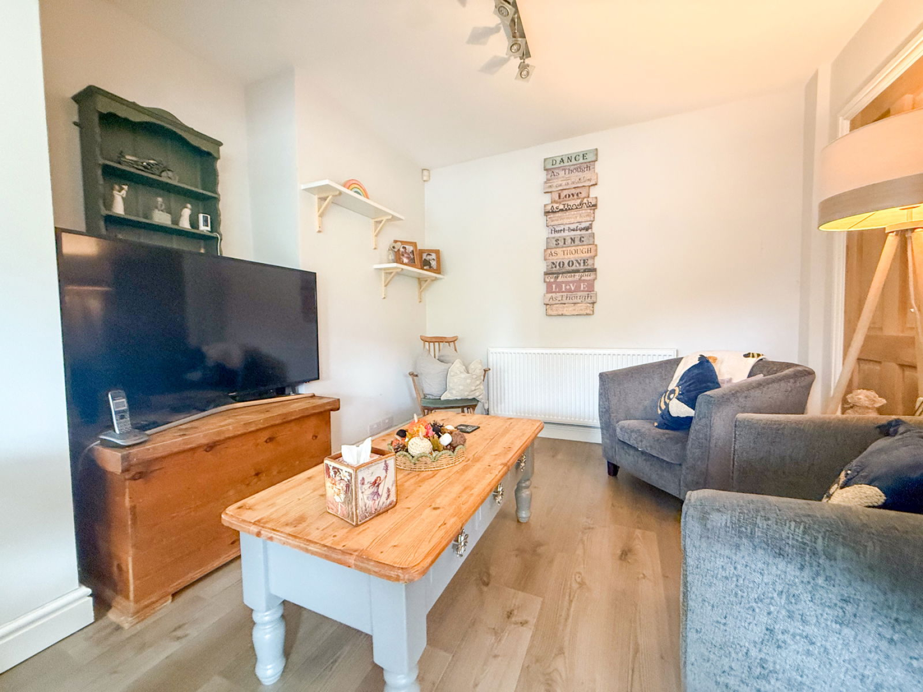 The generous living room boasts a large bay window with front aspect views, filling the space with natural light. Elegant ceiling coving adds a touch of character, while the centerpiece is a stunning cast iron gas fire with a solid wood surround and slate hearth, creating a cosy focal point.