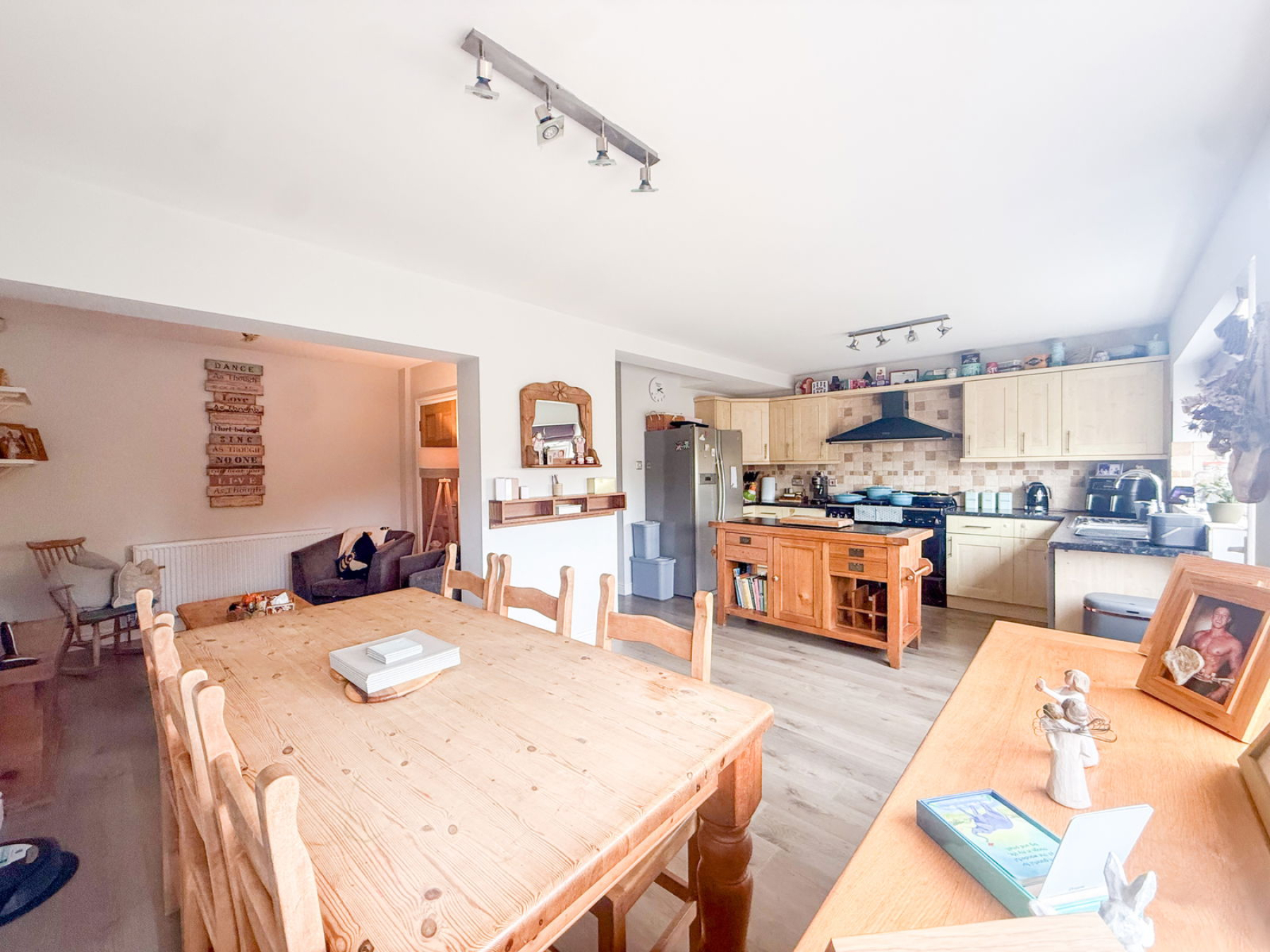 The ground floor extends into an impressive open-plan kitchen and dining room, thoughtfully extended to maximise space and functionality. The modern kitchen features a contemporary wooden flooring, a removable central island and integrated appliances, including a double range cooker, making it a perfect hub for family life and entertaining. The kitchen dining area opens seamlessly to a second reception space, the snug room, which is set back from the kitchen but still connected, providing a cosy and relaxing environment for family meals or unwinding in the evening.