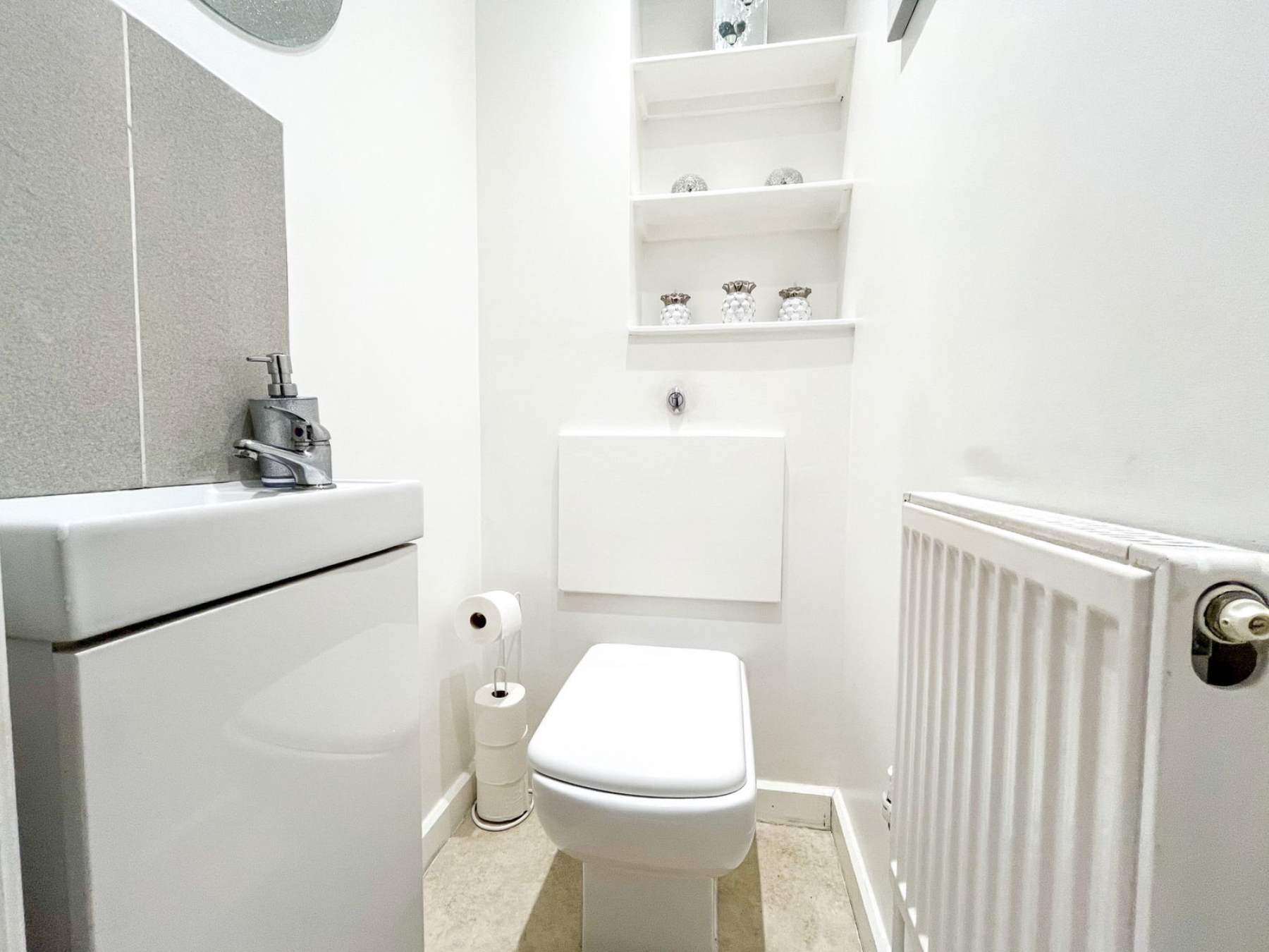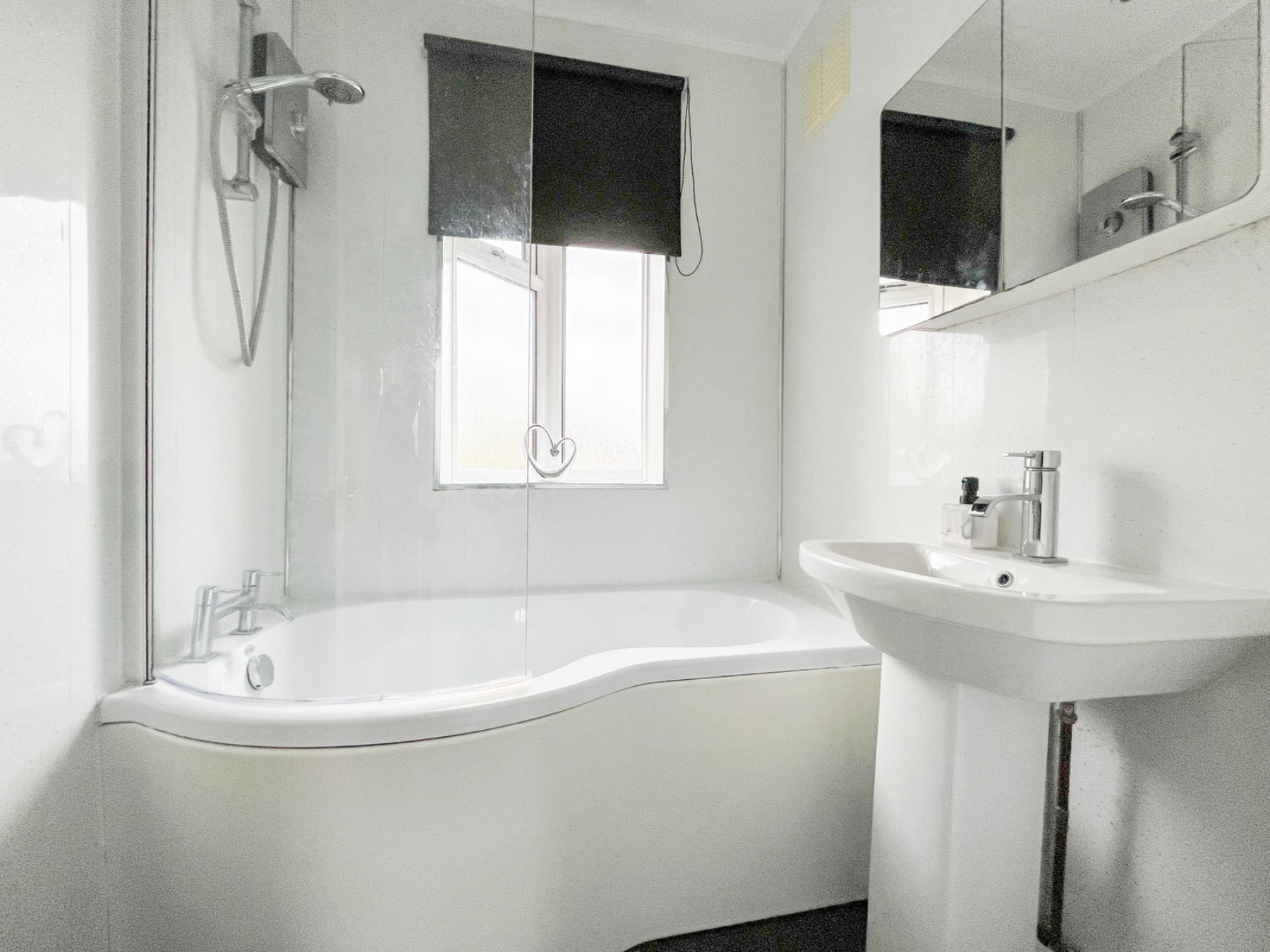 Upstairs, the property continues to impress with three spacious bedrooms and a modern family bathroom. The bathroom features a contemporary suite, including a P-shaped bath with an overhead electric shower, complemented by stylish white ceramic tiles.