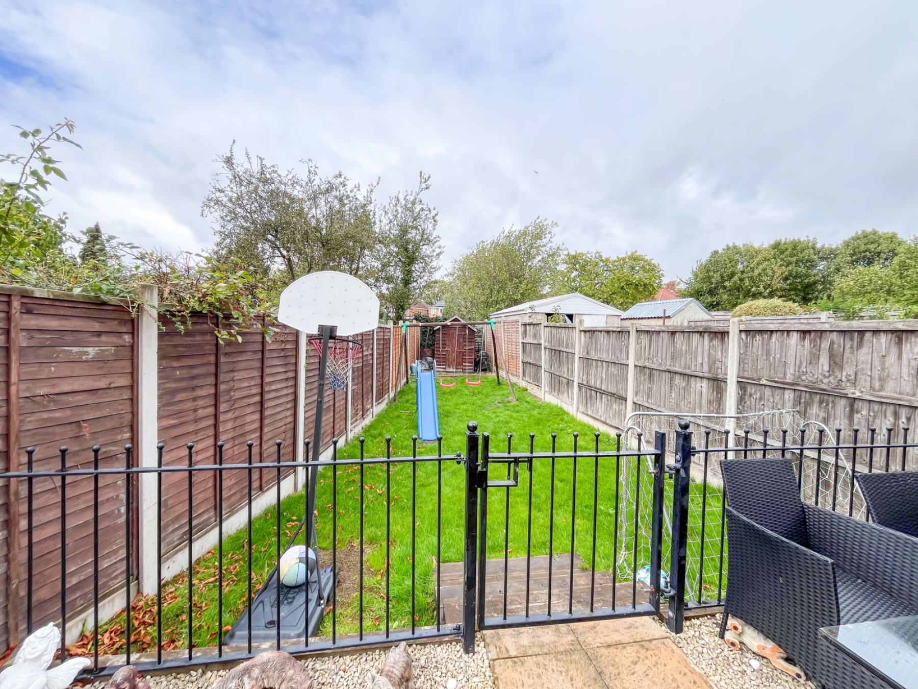 The rear garden is a true haven for outdoor living. It features a paved patio accessible from the utility area and the family living space, perfect for entertaining or relaxing in the sunshine. The spacious patio is enclosed by decorative metal fencing, making it safe for children and suitable for pets. Beyond the patio lies a large lawned area, complete with a child's swing and slide, creating a delightful outdoor play space. At the rear of the garden, a practical wooden shed offers additional storage.